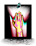 This body of work was created with my first scanner - an HPIICX flatbed. I constructed a box to sit over the top so that I could scan with the top up and still control some of the lighting. As the experiment grew, I began asking friends,relatives and associates if they would put their hands into the box and hold still for 5 minutes ar so. Most would just hold their hands in some pose but others would take items from their pockets and drop them on the scanner to give a more meaningful context to their hands. I also added to the group of images with my own story and gathered flowers, rocks, personal items from my world and added them to the scans too. The final prints for this group were produced on a mix of devices and substrates for a large installation at the now gone Speakeasy Cafe in Seattle's Belltown district. I printed on aluminum, large coated cotton sheets, a 27 panel installation on a versatec printer, laminated and mounted on archival gatterboard and even 1 print on reflective mylar.